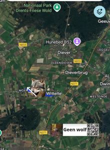 Wolf gezien, stond bij iemand op de dam bij mensen aan de Wapserveenseweg. Liep richting de Aaweg.