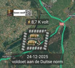 Aanval op schapen, 2 schapen gedood. Stonden achter een wolfwerend raster die in Duitsland veel gebruikt word. 8.7 kv op het draad!