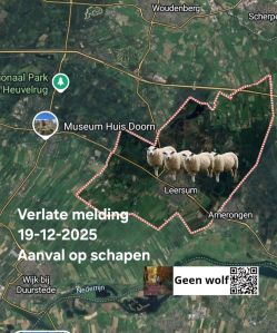 Goedemorgen, kwam net pas achter jullie bestaan vandaar dat ik het nu pas doorgeef. Van 18 op 19 dec is de wolf bij ons langs geweest en heeft 4 van de 6 schapen vermoord.