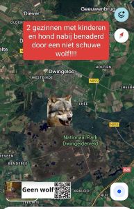 Gisteren hebben wij oog in oog gestaan met een Wolf in het Lheederzand, Dwingelerderveld. Wij zijn twee gezinnen met jonge kinderen en een hond. De Wolf heeft ons tot op 1,5 meter genaderd en was geïnteresseerd in onze hond. Gelukkig kwam er vanaf de andere richting een grote groep nordicwalkers waardoor de wolf na ongeveer 2 minuten toch afdroop.