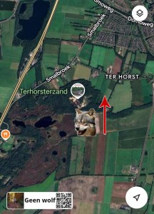 Een wolf gezien op de akkers bij Ter Horst. Liep richting het fietspad.