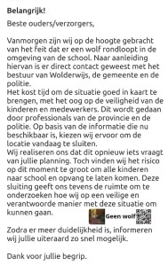 Vanwege deze waarnemingen heeft basisschool ’t Oelebröd besloten vandaag volledig gesloten te blijven. De school zou later openen in verband met gladheid, maar gezien de nabijheid van de wolf en de verwachte drukte op het schoolplein is uit voorzorg gekozen voor sluiting.