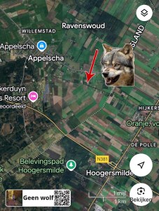 Wolf gezien bij de oprit van een boerderij aan de Bruggewijk. Liep met gang in de richting van de Drentseweg.