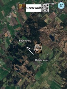 Rond 10 uur tussen Doldersum en Boschoord een wolf gezien door 2 amazones. Paarden reageerden niet op de wolf. Wolf liep richting Boschoord