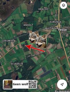 2 wolven bijna onder de auto gehad. Op de N375 (van Ruinen naar Pesse) Hectometerpaaltje 35,5. Wolf liep richting Ruinen.