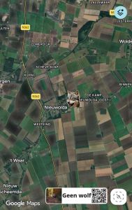Wolf stak de weg over 10 meter voor de auto. Bleef daarna in het land staan kijken 20 meter vanaf de weg.