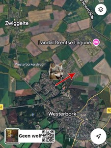 Wolf gezien vanochtend bij Perkenslag in Westerbork, hij liep richting Krommaat. Op het paadje tussen de huizen en de voetbalvelden.