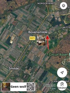 2 wolven in het land tussen Duikersloot en Witterweg liepen richting Bovensmilde circa 50 meter achter de huizen.