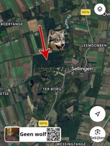 “Net een inwoner uit Vlagtwedde gesproken die in Sellingen aan het wandelen was. Groot Koolwitje richting Denneweg. Zijn hond liep los en rende weg omdat hij dacht een andere hond te zien. Het bleek een wolf. Tot dichtbij genaderd. De eigenaar heeft heel veel gefloten op zijn honden fluit maar de wolf was niet onder de indruk en heeft ze een tijdje op ongeveer 50 meter achtervolgd.