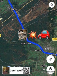 Wolf aangereden op de N309 tussen ‘t Harde en Epe. Hij was zichtbaar dood. Auto met schade aan de rechter voorkant stond iets verderop.