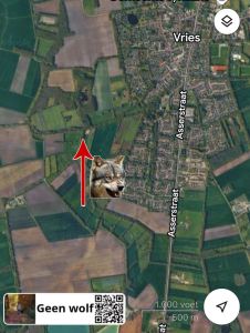 “Vanmorgen tijdens het uitlaten van de hond, rond 11:30 zag ik door het land een wolf lopen. Richting ging verder omhoog op de kaart.”