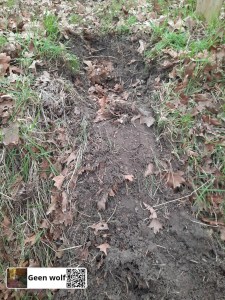 Goedgekeurd wolfwerend raster, onderste draad 10 cm boven de grond. Wolf er zichtbaar onderdoor gegraven.