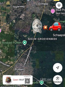 Wolf aangereden op de Putterweg (tussen Putten – Ermelo) ter hoogte van Sonneheerdt. Volgens ooggetuigen was het dier opslag dood.