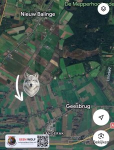 “Goedemiddag, Ik ben thuis in de tuin bezig en zag in het bos naast het huis met grote zekerheid een wolf, hij viel op door zijn loopje. Op de Twaalf Ellenweg, hij liep richting de Verlengde Hoogeveense Vaart”