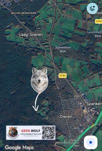 Wolf volgde ons. Na luid roepen en zwaaien draaide de wolf om en liep richting de Spelerij. Hij kwam vanuit gebied achter Jutberg.
