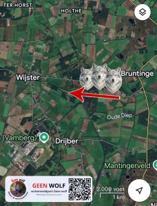 “Net 3 grote wolven weggejaagd op de Hamveld in Wijster, de Schotse Hooglanders naast ons sloegen aan. Het waren 3 grote wolven en 1 keek me recht aan in de zaklamp. Ze liepen het natuurgebied in richting Wijster”
