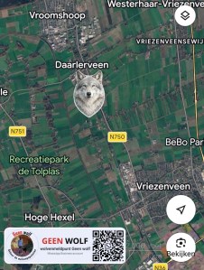 Wolf gezien op de Grote Veenweg in Daarlerveen. Locatie is in het buitengebied tussen Vroomshoop en Vriezenveen met bebouwing in de directe omgeving.