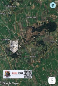 Wolf gezien nabij Militair oefenterrein Havelterberg, bij de Toren. Het was een wolf op 20 meter die ik zelf eerst niet zag maar mijn hondje wel en die stond helemaal stil en strak. Na drie keer kijken zag ik hem in het struweel onder de douglassparren. Als de hond niet gewaarschuwd had was ik hem zo in de armen gelopen. Ik ben langzaam achteruit gelopen en via een parallelweg naar de ‘amerikaanse weg’ teruggelopen. Ben me weer eens het apenzuur geschokken, pfffff!